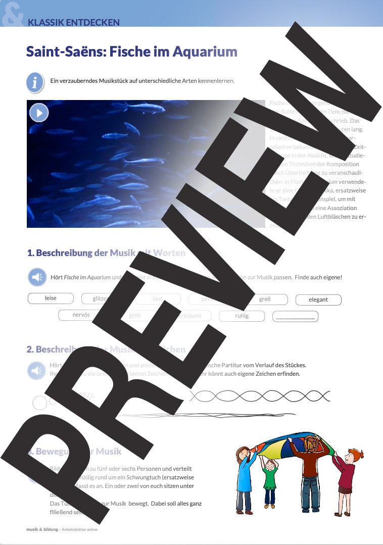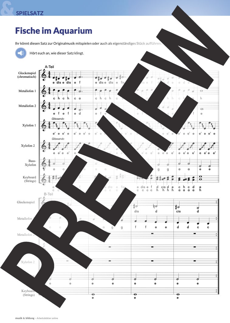 Der Klassiker von Camille Saint-Saëns  – erlebt auf vier Ebenen: verbal, grafisch, tänzerisch und mit aktivem Musizieren. Der Clou dabei ist ein Arrangement, das kinderleicht ist und trotzdem den bezaubernden Klangeindruck des Originals beibehält. Es funktioniert als Mitspielsatz oder auch „stand alone“. Ein Musikvideo stimmt emotional ein, das Audio mit dem Original dient zum Hören, analysiert und Mitspielen und das Klangmuster des Spielsatz vermittelt einen Eindruck vom Klangergebnis. Das AB enthält den Spielsatz in Matrix-Notation für jedes Instrument einzeln.