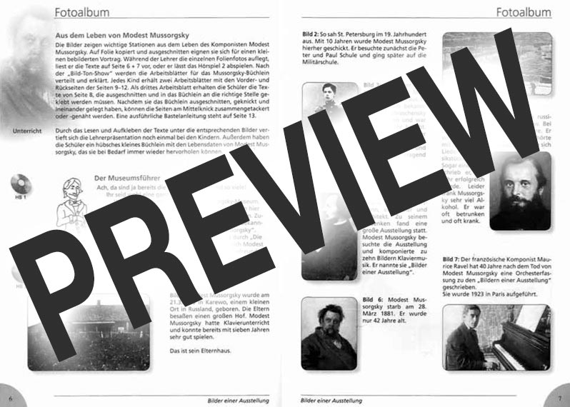 Alle musikalischen Sätze werden in knapper Form beschrieben und mit vielen methodischen Anregungen versehen. Da gibt es Bewegungsspiele, grafische Notationen, Bildgestaltungen, das Erfinden von Geschichten u.v.a.m. Großzügig angelegte kopierbare Arbeitsbögen erleichtern den Schülern und Schülerinnen die lohnende Auseinandersetzung mit Mussorgskys weltberühmter Musik. Auf der CD befinden sich Einzelausschnitte und Gesamtaufnahmen aller Sätze, dazu kleine Arrangements für schuleigenes Instrumentarium. Ein Sprecher führt informativ und spannend durch die Ausstellung, sodass der Museumsbesuch zu einem interessanten Spaziergang wird.