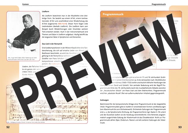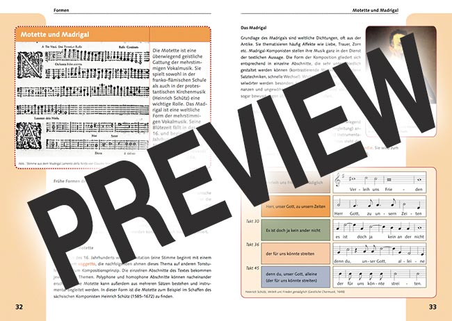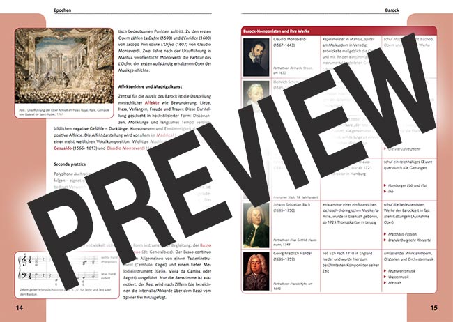 – Motette und Madrigal – Messe und Requiem – Fuge – Oratorium und Passion – Oper und Schauspielmusik – Suite und Tanz – Konzert – Sonate – Symphonie – Lied und Liedform – Programmmusik