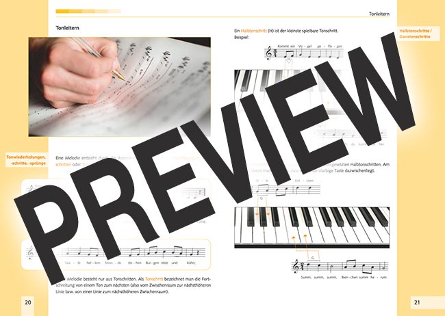 – Tonwiederholungen, -schritte, sprünge – Halbtonschritte/Ganztonschritte – Durtonleiter und -tonarten – Kreuztonarten (Dur) – B-Tonarten (Dur) – Molltonleitern und -tonarten – Kreuztonarten (Moll) – B-Tonarten (Moll) – Harmonisches Moll – Melodisches Moll – Quintenzirkel der Dur-Tonarten – Quintenzirkel der Moll-Tonarten – Weitere Tonleitern